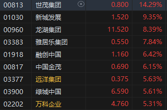 内房股全天涨势强劲,世茂集团涨超14%。消息面上,近期,据2024年6月的最新市场数据显示,二手房市场经历了一些积极变化。外围市场也有利好,美国6月通胀数据超预期降温增强了对美联储降息的押注。分析人士认为,港股市场受到美联储货币政策的影响较为显著,对其存在明显且迅速的反馈。若美联储逐渐进入降息周期,根据港币锚定美元、香港的利率水平与美联储趋势基本一致来看,港股估值有望大幅提升。